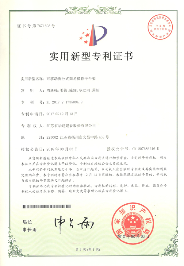 北京公司獲一項實用新型專利 時間:2018-09-07 3249 近日,從國家知識產權局傳來喜訊,北京公司發布的《可移動拆分式簡易操作平臺架》(專利號:ZL201721735084.9)獲得實用新型專利。