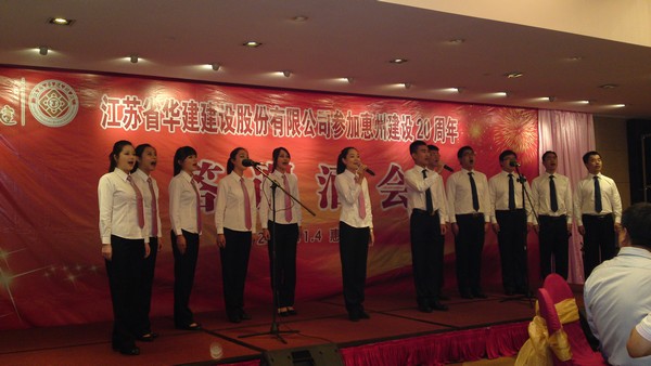 在演出中,由惠州公司員工莊曙演繹的男聲獨(dú)唱《把一切獻(xiàn)給黨》,以高亮的美聲唱法,讓在座嘉賓擊掌叫好;渾厚深沉的歌聲,給在場(chǎng)觀眾無(wú)盡遐想;一句“千萬(wàn)年守候,永不回頭”,更是唱出了華建人對(duì)事業(yè)的忠誠(chéng)與信念,對(duì)未來(lái)的堅(jiān)定與信仰。此后,由惠州公司12名男女員工組成小合唱團(tuán)演唱的《華建之歌》,則用熟悉而又清麗的形式抒寫(xiě)了一曲華建頌歌。激情昂揚(yáng)的旋律、朗朗上口的歌詞,展示了三十年來(lái)公司取得的非凡成績(jī);形式新穎的合唱風(fēng)格、清新不俗的表演方式,掀起了整場(chǎng)酒會(huì)演出的高潮;臺(tái)上的小合唱變成了在場(chǎng)華建人的大合唱,掌聲歡呼聲此起彼伏,酒會(huì)取得了圓滿(mǎn)成功。