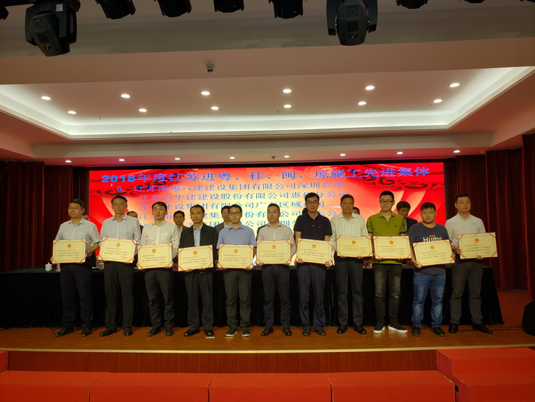 會(huì)議表彰了一批江蘇出省施工先進(jìn)集體及先進(jìn)個(gè)人。其中,惠州公司被江蘇省住房和城鄉(xiāng)建設(shè)廳表彰為2018年度江蘇出省施工先進(jìn)集體,總經(jīng)理周群利、技術(shù)質(zhì)量處主任陳申高被江蘇省住房和城鄉(xiāng)建設(shè)廳表彰為2018年度江蘇出省施工先進(jìn)個(gè)人;黃秀剛、邵群斌、王興東分別被江蘇省人民政府駐深圳(廣州)辦事處表彰為2018年度江蘇進(jìn)粵、桂、閩、瓊施工質(zhì)量安全、經(jīng)營(yíng)財(cái)務(wù)和新聞報(bào)道先進(jìn)個(gè)人。