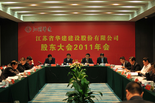 另訊 4月30日下午,江蘇華建房地產開發有限公司股東會2011年會在泰州召開。宗有農同志主持會議,與會股東代表聽取和審議了華房總經理吳士茂的工作報告和總會計師李長棟所作的財務報告及股利分配方案。會上陸金龍董事長詳細分析了當前全國房地產市場的形勢,并提出下一階段房地產開發總體要求。