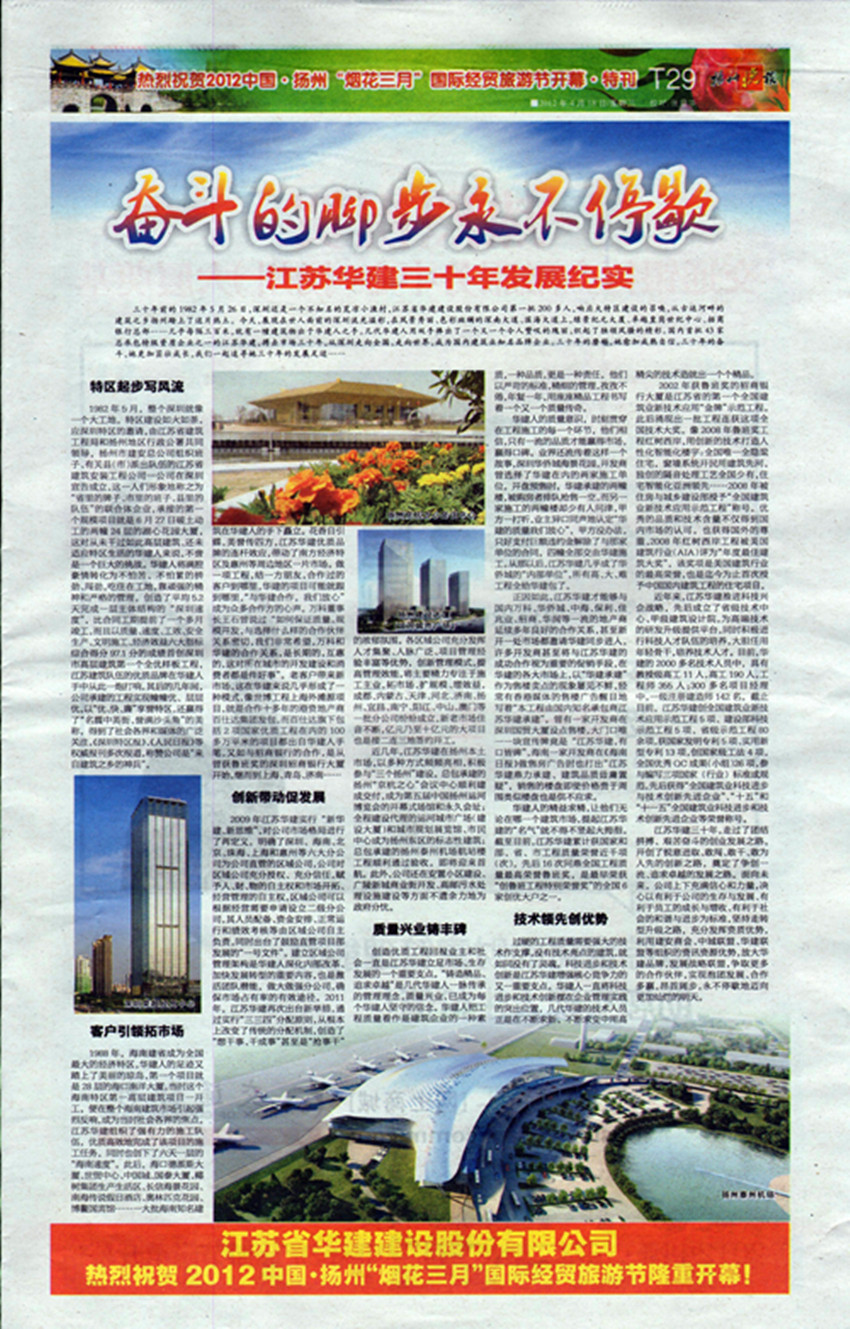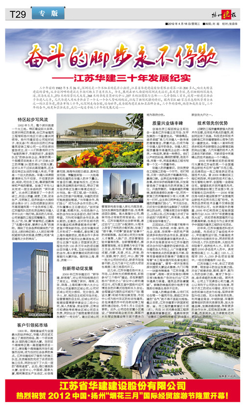 《揚州晚報》專版刊發公司三十周年宣傳文章 時間:2012-04-19 6053 4月18日,《揚州晚報》T29版刊發專版文章《奮斗的腳步永不停歇——江蘇華建三十年發展紀實》,從公司起步、市場開拓、創新發展、質量與科技等各個層面,介紹了公司三十年的奮斗歷程、綜合實力和發展業績。