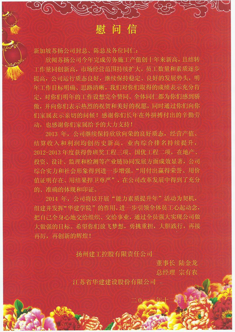 公司董事長、總經理發慰問信鼓勵新加坡蘇揚公司再接再厲 時間:2013-12-13 3674 12月中上旬,公司總部完成了對國內各區域公司的年終走訪調研。新加坡蘇揚公司則通過電子稿匯報了2013年工作情況及下年度工作思路。2013年新加坡蘇揚公司主要經濟指標創歷史新高;隊伍規模保持穩定;班組承包責任制成果顯著;市場份額持續擴大。總部認為這一年來蘇揚公司保質態,擴市場,穩增長,取得了不俗成績,公司董事長陸金龍、總經理宗有農特發慰問信鼓勵蘇揚公司再接再厲,再創新高!慰問信全文如下: