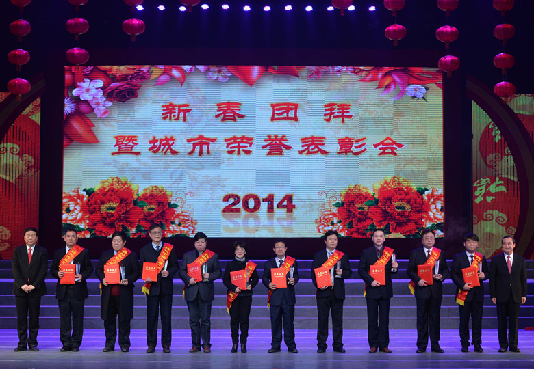 在1月12日晚揚州市委、市政府召開的2014新春團拜暨城市榮譽表彰會上,公司副董事長、總經理宗有農當選為“揚州市十大功臣”,揚州市委書記謝正義親自為宗有農總經理頒獎。