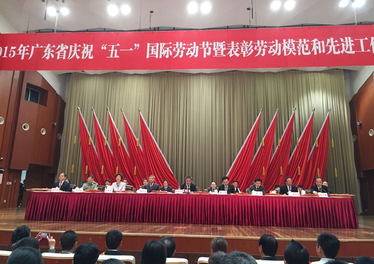 4月27日上午,2015年廣東省慶?!拔逡弧眹?guó)際勞動(dòng)節(jié)暨表彰勞動(dòng)模范和先進(jìn)工作者大會(huì)在廣州白云國(guó)際會(huì)議中心舉行。廣東省委書(shū)記胡春華、省長(zhǎng)朱小丹等領(lǐng)導(dǎo)參加會(huì)議。