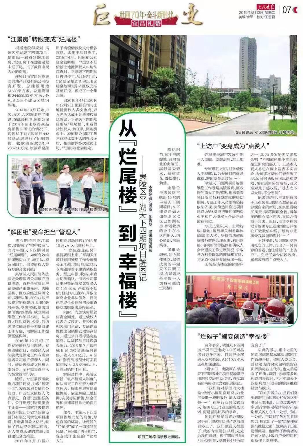 《三峽晚報(bào)》8月13日第7版整版報(bào)道了江蘇華建宜昌分公司總承包建設(shè)的平湖天下四期項(xiàng)目。