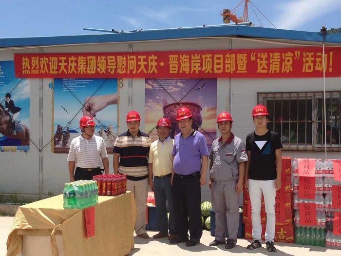 千里送清涼——天慶集團(tuán)董事長韓慶慰問我司一線職工 時(shí)間:2015-08-05 4224 8月4日中午,烈日當(dāng)空,驕陽似火。甘肅天慶房地產(chǎn)集團(tuán)有限公司董事長韓慶一行不遠(yuǎn)千里來到廣東珠海,頂著烈日,冒著酷暑,在項(xiàng)目負(fù)責(zé)人陳建的陪同下,慰問我司承建的“天慶·晉海岸”項(xiàng)目一線施工人員,給工人們送來了西瓜、礦泉水、王老吉等飲品和深情問候,讓廣大一線職工在炎炎烈日下感受到陣陣清涼。
