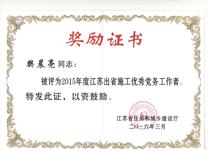 重慶分公司被表彰為“2015年度江蘇出省施工先進企業” 時間:2016-04-20 3048 近日,重慶分公司被江蘇省住房和城鄉建設廳表彰為“2015年度江蘇出省施工先進企業”,重慶分公司總經理嚴正濤榮獲“2015年度江蘇出省施工優秀企業經理”稱號,樊晨亮被評為“2015年度出省施工優秀黨務工作者”。