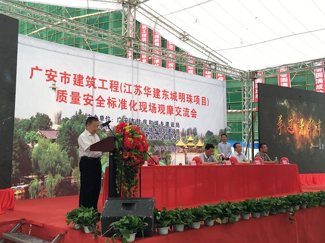 7月18日上午,廣安市2017年建筑工程質量安全標準化施工現場觀摩會在我司東城明珠項目召開,廣安市住建局總工程師劉運舉、岳池縣副縣長楊偉和公司總部領導程杰、吳士茂、重慶分公司總經理嚴正濤、副總經理龐文榮、田大浪等參加會議。