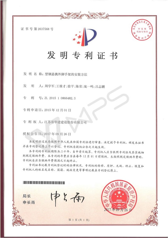 近日,江蘇華建珠海區(qū)域公司《型鋼懸挑外腳手架的安裝方法》獲得國家發(fā)明專利授權,這是珠海區(qū)域公司獲得的第一個國家發(fā)明專利授權。