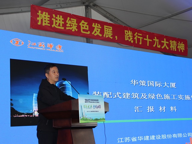 公司總工周學(xué)軍在現(xiàn)場會(huì)上對華策國際大廈工程綠色施工和裝配式技術(shù)應(yīng)用情況進(jìn)行了介紹