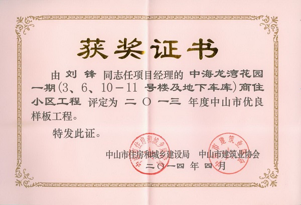 2013年度中海龍灣花園一期商住小區(qū)工程中山市優(yōu)良樣板工程