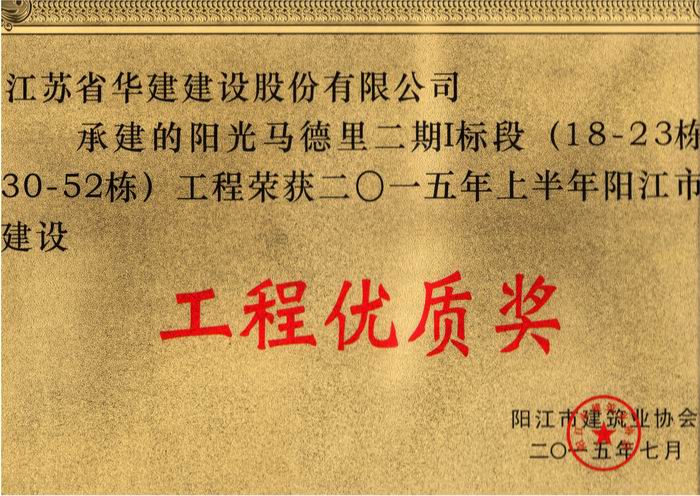 陽光馬德里二期I標段(18-23棟、30-52棟)工程獲 2015年上半年陽江市建設工程優(yōu)質獎
