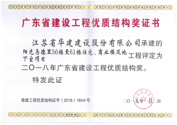陽光馬德里獲2018年廣東省建設(shè)工程優(yōu)質(zhì)結(jié)構(gòu)獎(jiǎng)