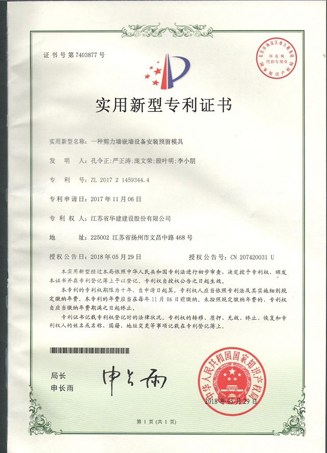 近日,從國家知識產(chǎn)權(quán)局傳來喜訊,公司申請的《一種剪力墻嵌墻設(shè)備安裝預(yù)留模具》獲得實(shí)用新型專...