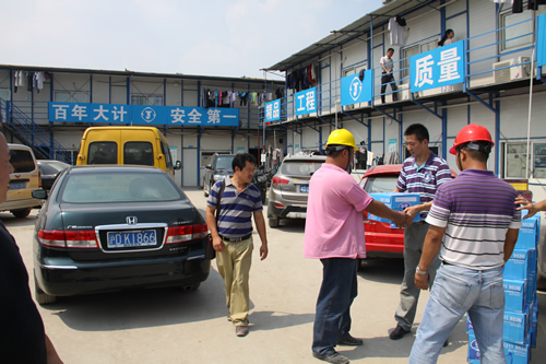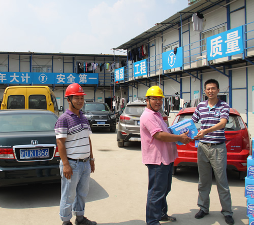 驕陽似火,熱浪滾滾,持續(xù)近一個(gè)月的高溫天氣給工程正常施工帶來了很大的影響,奮戰(zhàn)在烈日炎炎下的一線員工的身體狀況時(shí)刻牽動(dòng)著公司領(lǐng)導(dǎo)的心。7月29日,上海室外溫度更是超過40度,江蘇華建副總經(jīng)理、上海分公司總經(jīng)理?xiàng)罱芴氐匚锌偣こ處熚捍好鳌⒐?huì)副主席陳德權(quán)等同志赴由公司承建的上海楓葉國際學(xué)校工地看望一線作業(yè)人員,為員工送去了礦泉水、毛巾等清涼慰問品,并叮囑要注意避開高溫作業(yè)時(shí)段,保護(hù)身體,確保夏季施工生產(chǎn)安全。