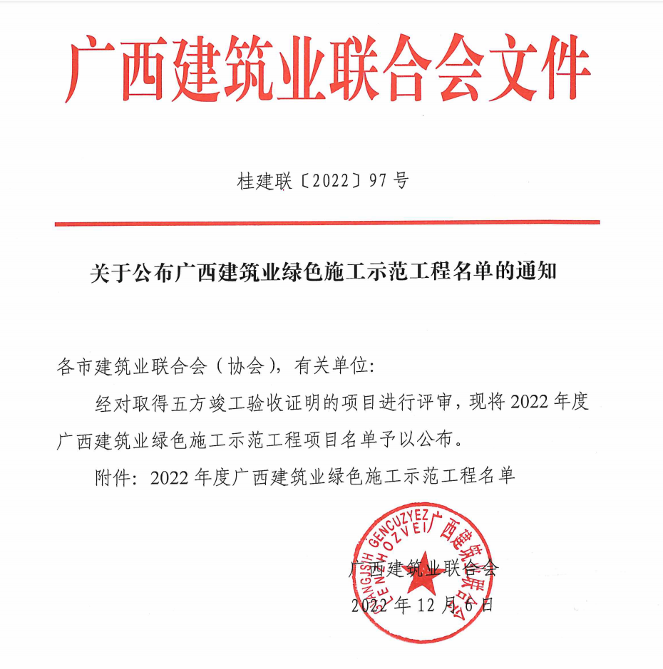 北京分公司兩項工程獲廣西建筑業綠色施工示范工程安全創優獎項 時間:2022-12-30 2111 近日,從廣西建筑業聯合會傳來喜訊,由北京公司總包承建的楊柳郡柳園1#、2#、3#、4#樓及地下室項目和楊柳郡柳園5#、6#、7#及地下室項目榮獲“2022年度廣西建筑業綠色施工示范工程”光榮稱號。