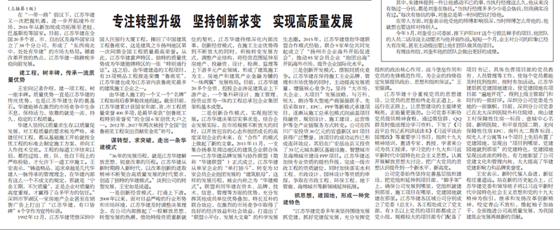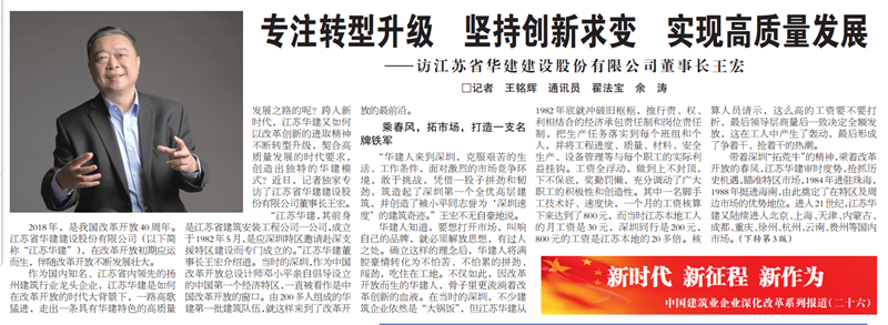 王宏董事長接受《建筑時報》專訪:專注轉型升級,堅持創新求變,實現高質量發展 時間:2018-09-11 4213 9月10日,《建筑時報》頭版及微信公眾號對王宏董事長的專訪給予了刊載。 王宏董事長在專訪中就江蘇華建成立36年來,是如何在改革開放的時代大背景下,走出一條具有華建特色的高質量發展之路,跨入新時代,江蘇華建又是如何以改革創新的進取精神不斷轉型升級,契合高質量發展的時代要求,創造出獨特的華建模式進行了詳細介紹。