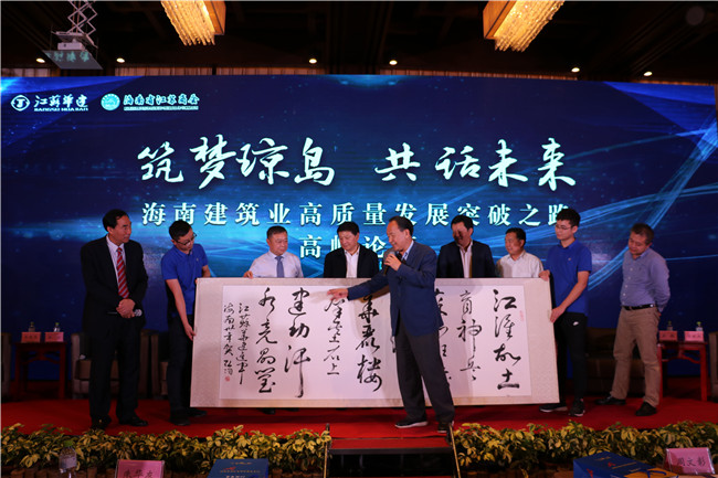 論壇上,原海南省委常委、宣傳部長、國家行政學院原副院長周文彰欣然為江蘇華建進瓊三十周年賦詩題字:“江淮沃土育神兵,蘇北班輸天下行。華麗樓群基石上,建功汗水亮晶瑩”。