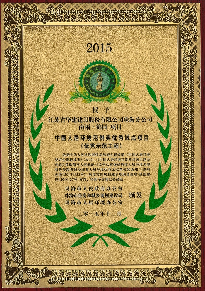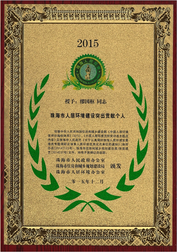公司榮獲珠海市人居環境建設突出貢獻單位等四項表彰 時間:2015-12-22 4448 近日,珠海公司被珠海市人民政府辦公室、珠海市住房和城鄉規劃建設局和珠海市人居環境辦公室聯合表彰為珠海市人居環境建設突出貢獻單位(優秀建筑施工企業),繆國樞總經理被授予珠海市人居環境建設突出貢獻個人稱號,由我公司承建的拱北海關業務技術綜合樓及南福·錦園項目榮獲中國人居環境范例獎優秀試點項目(優秀示范工程)。